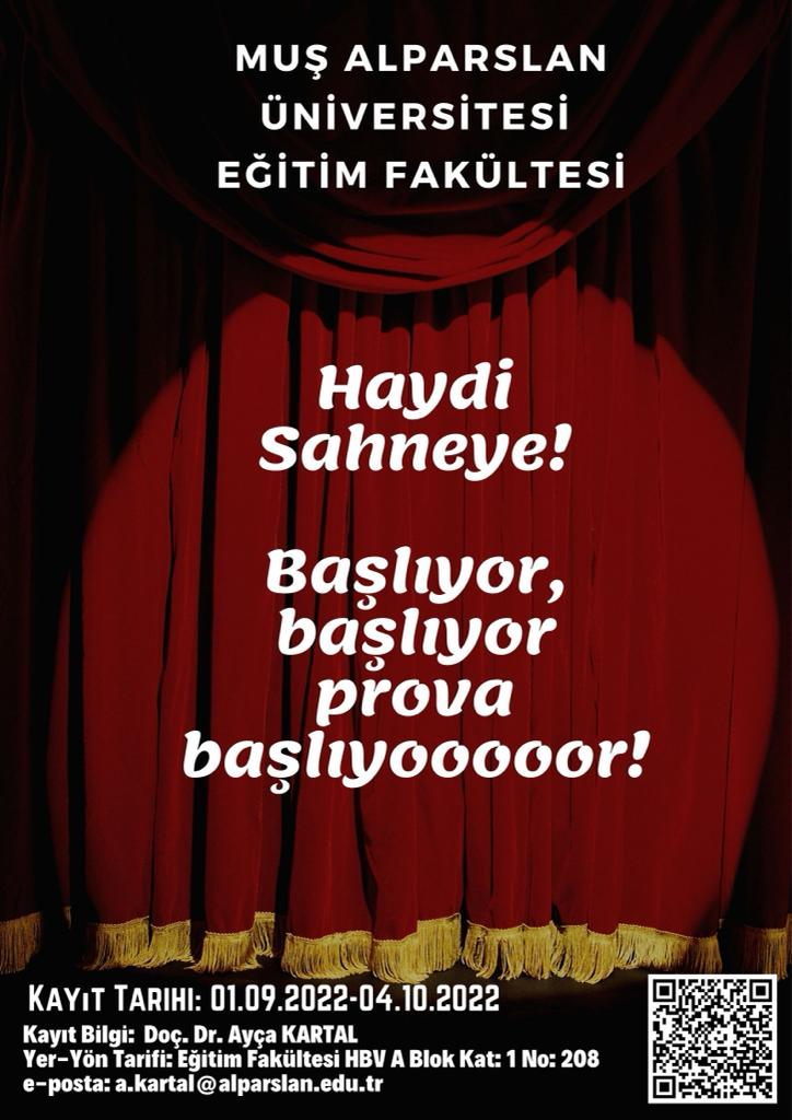 Muş Alparslan Üniversitesi Eğitim Fakültesi 2022-2023 Eğitim Öğretim Dönemi tiyatro eğitimi ve oyununda yer almak  için tıklayınız.